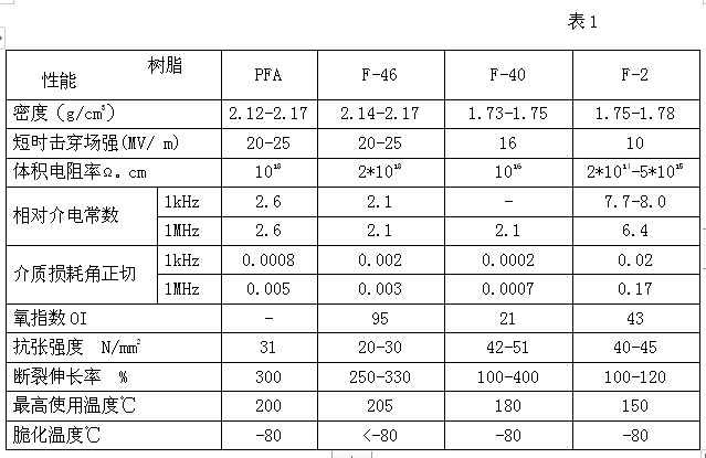 氟塑料種類有聚四氟乙烯(PTFE,簡稱F-4)、四氟乙烯與全氟(正)丙基乙烯基醚的共聚物(PFA)、聚全氟乙丙烯(FEP,簡稱F-46)、乙烯-四氟乙烯共聚物(ETFE,簡稱 F-40)、聚偏氟乙烯(PVDF,簡稱F-2)、聚三氟氯乙烯(PCTFE)、聚氟乙烯(PVF)、四氟乙烯-六氟丙烯-偏氟乙烯的共聚物(THV)等。氟塑料中F-4但綜合性能最好,但加工困難,通常用于電力電纜的有PFA、F-46、F-40、F-2等.材料的電氣機(jī)械性能如表1所示。