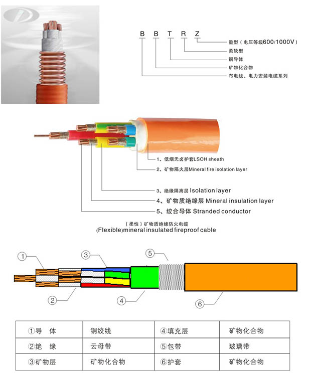 相對傳統(tǒng)的BTTZ剛性礦物絕緣電纜, BBTRZ柔性礦物絕緣電纜是由銅絞線、礦物化合物絕緣、和礦物化合物護套所構(gòu)成。其采用柔性結(jié)構(gòu),主要材料均采用無機材料,彌補了結(jié)構(gòu)硬、易燃燒、有毒等缺陷,并且具有一些其他電纜不具有的優(yōu)點,如:耐火、載流量大、耐沖擊電壓、耐機械損傷、無鹵無毒、防爆、防水、耐腐蝕、壽命長、安全、耐過載、耐高溫、成本低等特點。